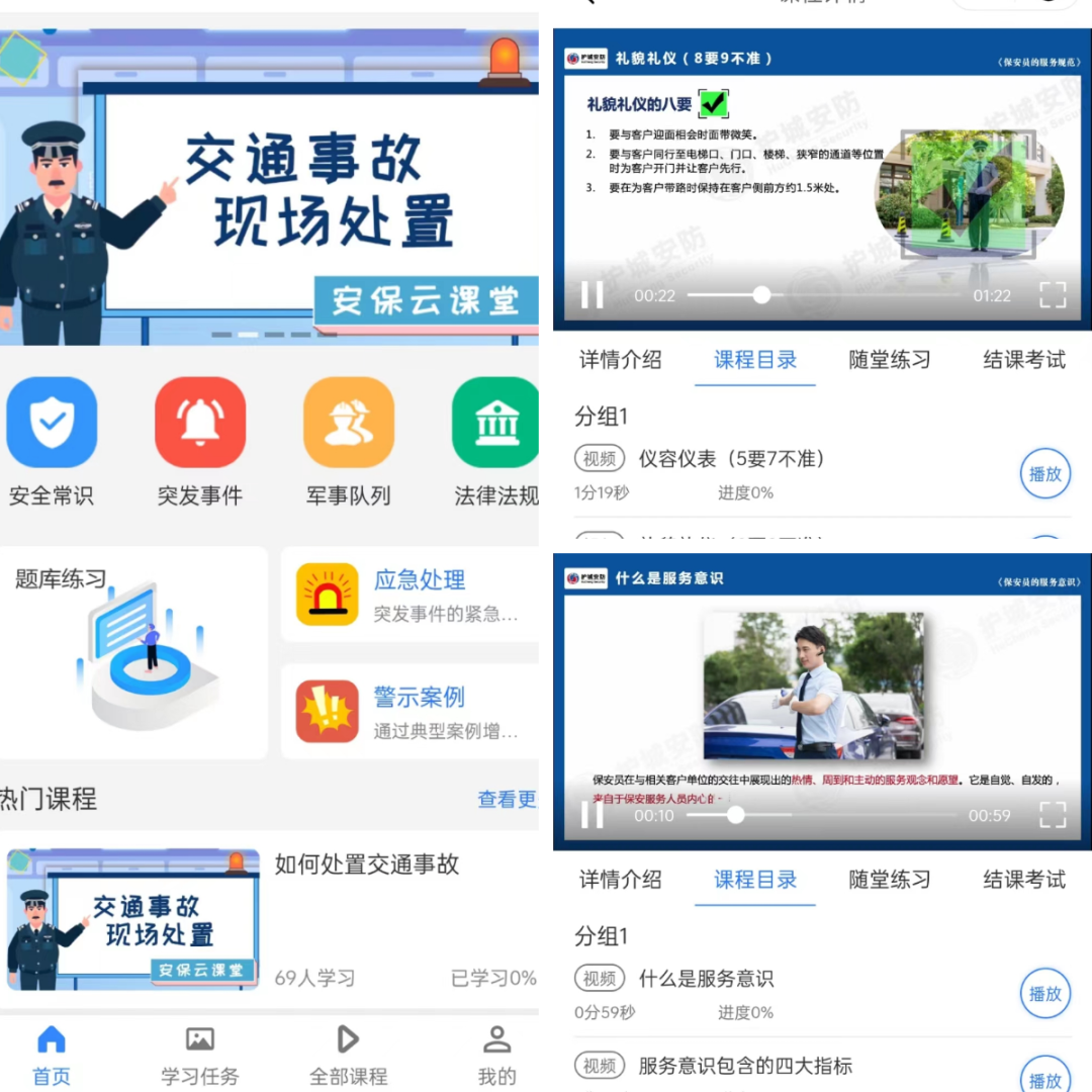 保安市場開放以來,為了適應市場的快速發展,提升服務品質和市場化管理步伐,從基本的保安服務到增值服務,對保安員的要求也在不斷地提高。為了更好地適應社會的發展,為了讓保安員更快,更好地學習專業技能、了解專業資訊,近日,楒科集團旗下廣東護城智慧安防科技有限公司研發的“安保雲課堂”小程序正式麵向全國免費上線使用。湖南91视频看片网站保安作為集團旗下公司,更是第一時間在全司推行“學習月”活動,學習相關課程,分享日常工作等。學員隻需搜索“安保雲課堂”微信小程序,選擇對應的版塊,通過點選學習任務中的相應課程進行學習,學員退出場景時可選擇參加考試,答題結束後自動打分,未通過考試則可反複回看學習並重新測試。